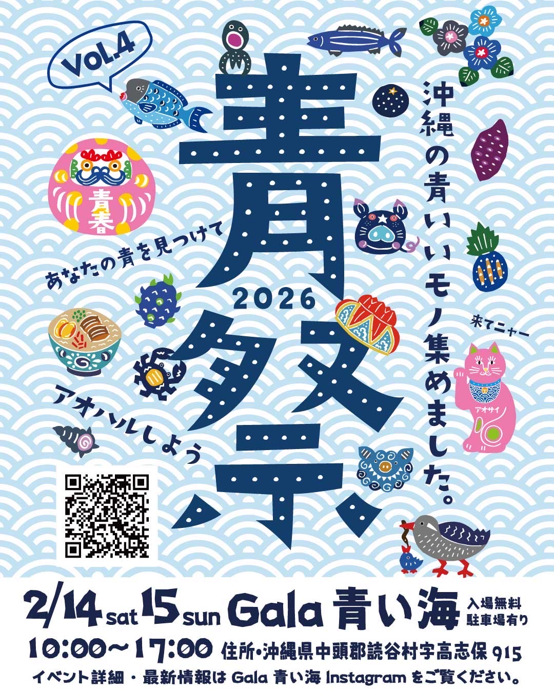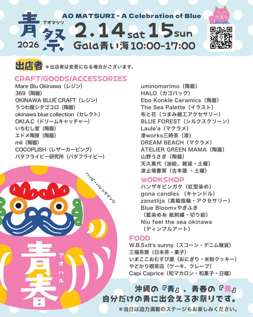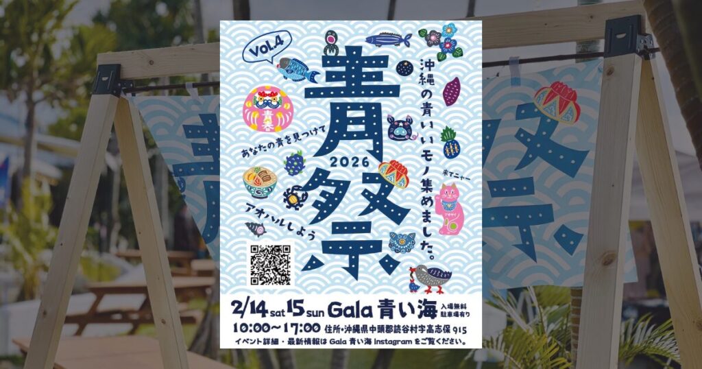 2026年2月14日(土)・15日(日)の2日間、Gala青い海にて「青祭 vol.4 -ao matsuri-」が開催されます。「青」をテーマに2023年から始まったこのイベントは、年に一度行われていて、今回が4回目の開催となります。沖縄の『青』、青春の『青』、自分だけの青に出会えるイベントとなっています。