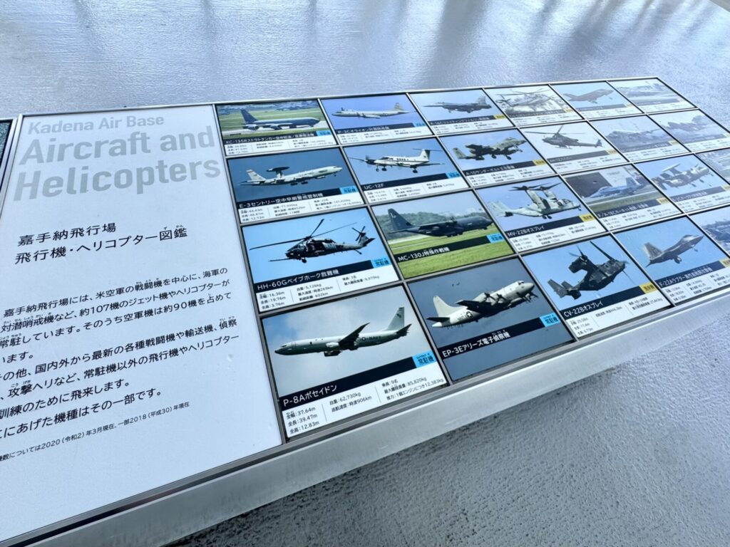 展望所には、飛来する航空機の種類を紹介するパネルも設置。戦闘機や輸送機など、実際に目の前で離発着する機体と照らし合わせながら楽しめます。