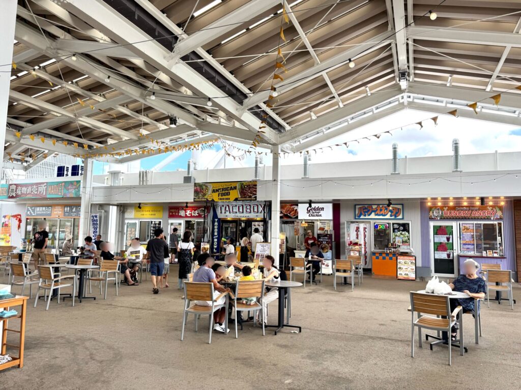 1階にはお土産店や農産物の直売所、様々な飲食テナントと飲食スペースがあります。地元の人にはおなじみの「ロータリードライブイン」のジャンボチーズバーガーは有名ですが、他にも魅力的なテナントが揃っています。日替わりでキッチンカーの出店もあるようなので、訪れるたびに新しい発見がありそうです。