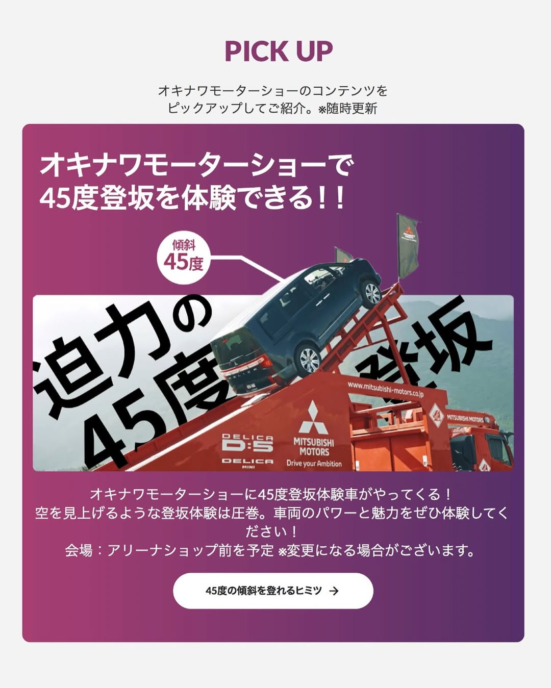 今回の新たな体験コンテンツとして、三菱自動車の4WD車両による45度登坂体験がお目見え。公式サイトで紹介されている画像で見てみると、驚きの角度…。生で見るとすごく迫力がありそうです。