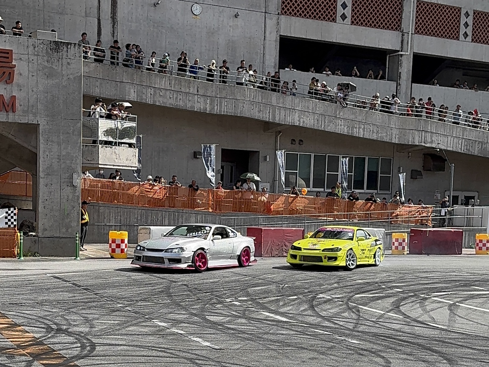 オンロード会場にて行われるドリフトデモ走行。今年はD1「Team TOYO TIRES DRIFT」所属の藤野秀之選手・玉城詩菜選手がデモ走行に登場。