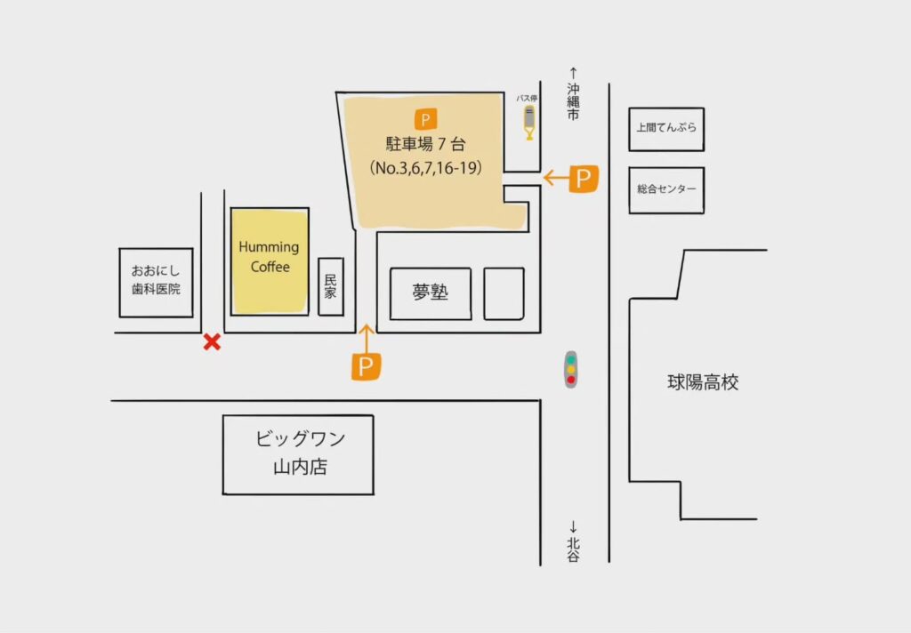 駐車場自体は20台ほど停められそうな広さがありますが、店舗用として利用できるのは7台分のみ。駐車スペースには「Humming Coffee」の表示と赤いカラーコーンが置かれているので、停める際は確認しておくと安心です。