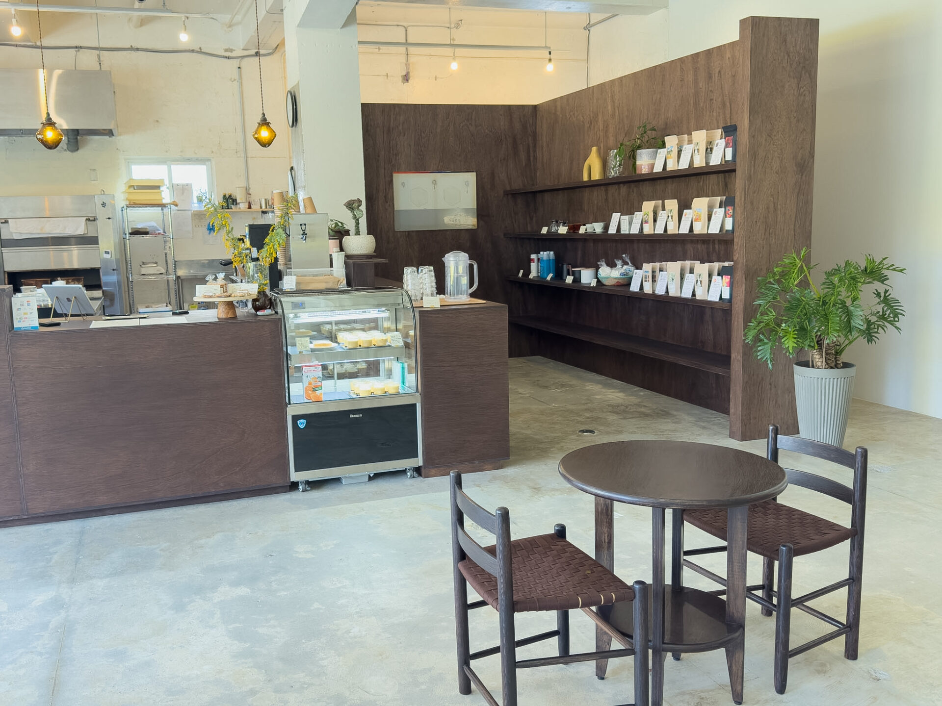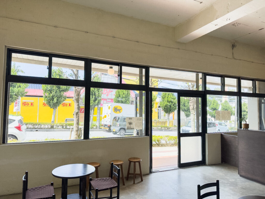店内は広々としていて、2名掛けのテーブル席が5席ほど。道路に面した窓から自然光が入り、明るく開放感のある空間が広がっています。